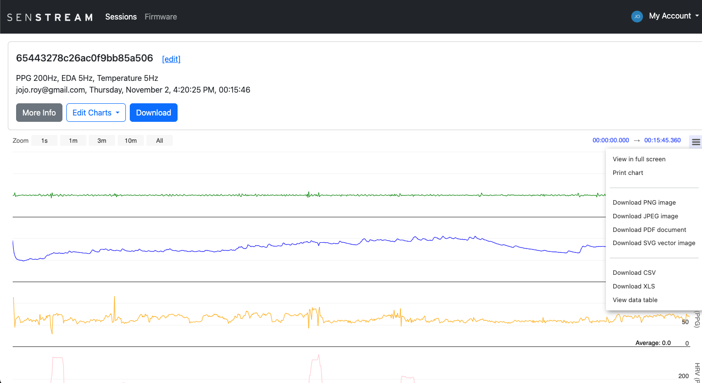 Alternatively, while viewing a session's charted data you can click the small icon on the right hand side of the screen. The icon is three horizontal bars, and when you click it you will see options that allow you to select